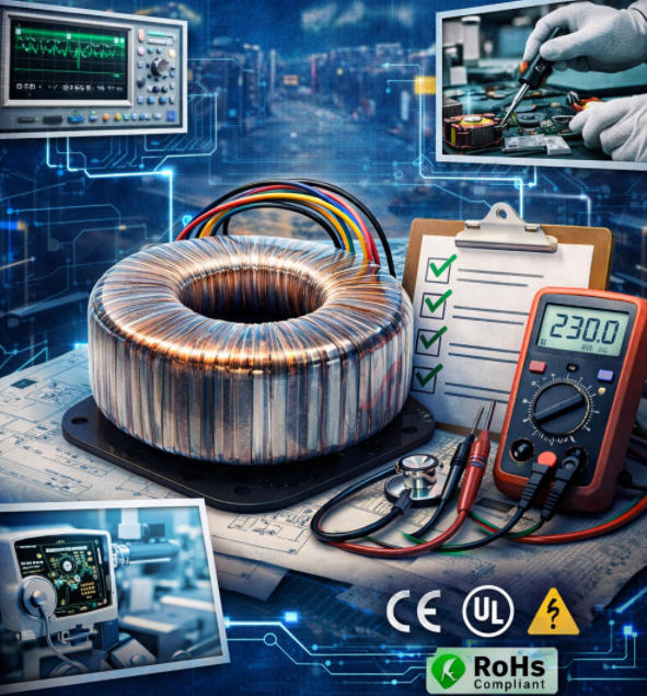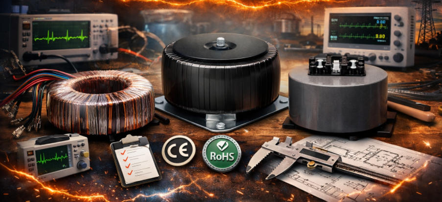 When selecting a toroidal transformer, it’s critical to ensure it meets the safety and compliance standards of your destination market. These certifications confirm that the transformer has been tested for electrical insulation, thermal safety, fire resistance, and environmental responsibility.