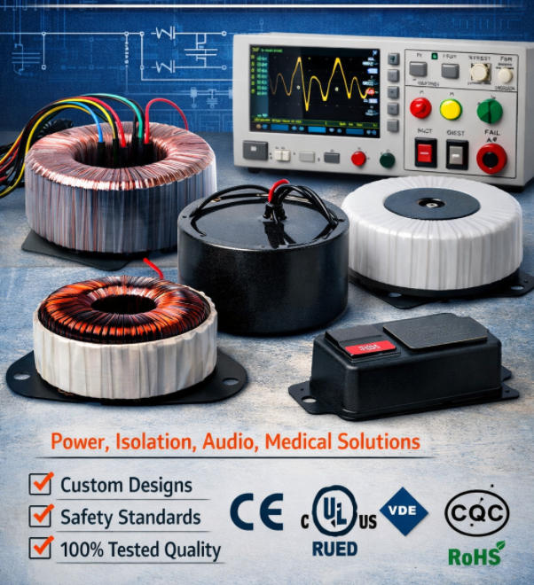 Once I’ve confirmed the voltage and power ratings, I ask myself: what specific type of toroidal transformer does my application need? Not all toroidals are created equal some are optimized for power delivery, others for electrical isolation, and some for ultra-low noise environments. Choosing the wrong type can limit performance or even violate safety standards.